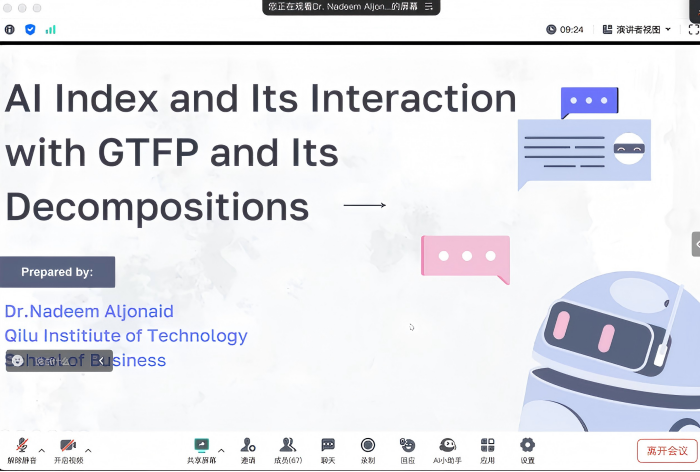 更新时间:2025-04-25 13:59 4月15日晚,商学院开展本月学术活动,本次学术活动由商学院NADEEM博士带来主题为《人工智能与绿色全要素生产率之间的相互作用》的学术讲座。讲座中,NADEEM博士主要就AI指数的介绍及其发展、构建复核人工指数的方法、人工智能通过其三个分解与GTFP的交互、人工智能对GTFP的影响结果(以中国为例)等方面对全体教师进行了介绍。