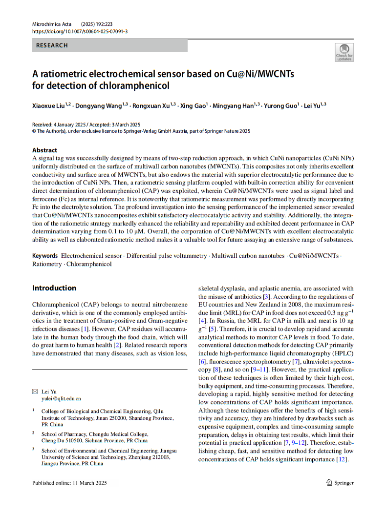 生物与化学工程学院于磊在《Microchimica Acta》发表论文