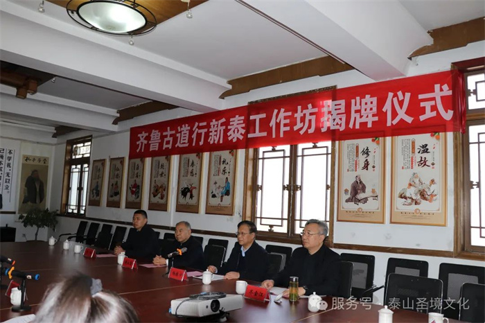 3.揭牌仪式由山东省文史研究馆馆员、问鼎网页版登录入口齐鲁文化研究院院长、曲阜师范大学原校长傅永聚,新泰市委常委、宣传部部长周典红,共同为“齐鲁古道行新泰工作坊”揭牌。