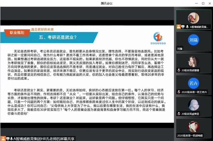 更新时间:2022-05-15 13:45 5月14日,文学院邀请山东智博威教育科技集团金牌讲师付碧波讲师为我院英语专业学生做题为《如何准确认识你自己》线上职业规划专题讲座。