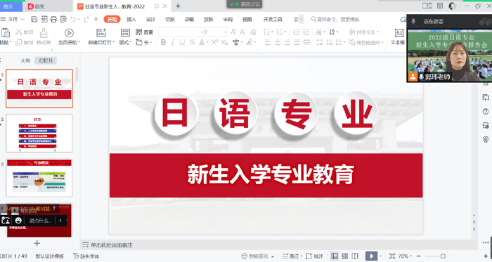 在主会场,高仲合院长代表文学院师生向2022级新生表示热烈欢迎,对全体新生提出殷切要求,希望每位学子明确发展方向,认真学习,成长成才,回馈社会。秦院长从学校发展历史、准确的办学定位、鲜明的办学特色、创新的培养模式、完善的课程体系等多方面介绍了学校的办学理念和办学特色,就文学院发展概况、组织机构、办学优势、学院特色等方面向同学们做详细介绍。在各分会场,英语专业负责人李勇、应用英语专业负责人庄雪、汉语言文学专业负责人李长培、秘书学专业负责人周丽妍、日语专业负责人郭玮分别向各专业同学介绍了本专业的培养目标、人才培养体系、学习策略、就业发展方向等内容。