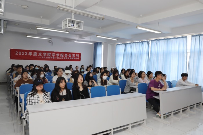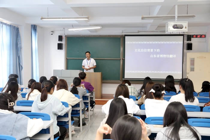 李老师以自强不息、厚德载物、和合共生、穷变通久为引,向同学们传授了中华优秀传统文化精髓;以山东省博物馆介绍为切入点,将博物馆见证历史、以史鉴今、启迪后人的作用加以传达。随后,李老师结合山东省博物馆英译现状将博物馆翻译中的文本类型翻译功能、翻译策略及文化记载存在问题向同学们作了详细阐述。