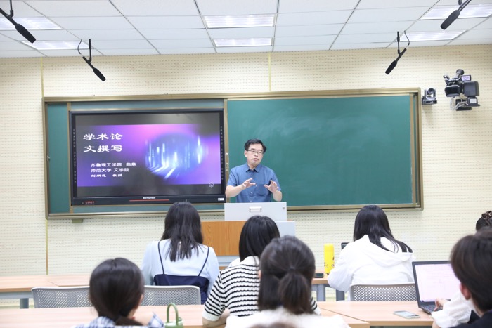 报告中,刘教授结合自身科研经历,从学术论文选题原则、题目确定原则与方法、论文的撰写与发表等方面同老师们进行了交流,并就题目确定的新观点、新概念、新问题、新思路、新内容和论文发表的特点、要求、格式、渠道等方面进行详细介绍。