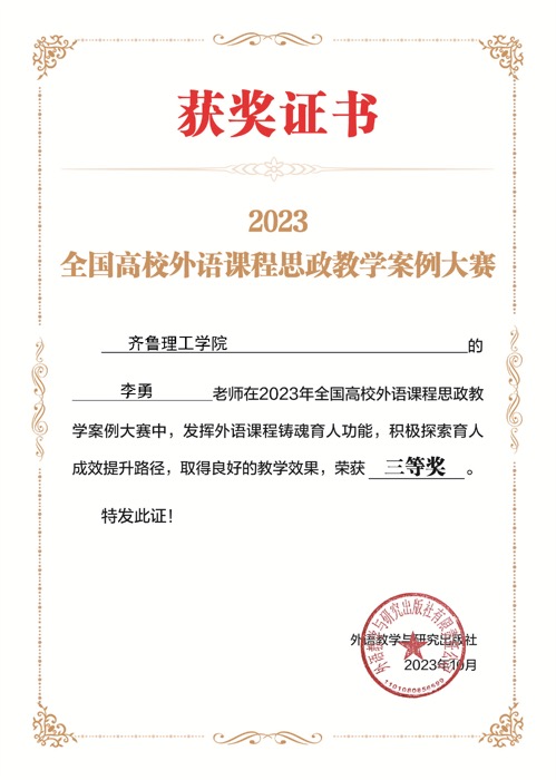 2023年全国高校外语课程思政教学案例大赛由外语教学与研究出版社举办,目的在于全面推进高校外语课程思政高质量建设,落实立德树人根本任务,赛事旨在搭建沟通交流课程思政育人实践的平台,实现提升课程思政建设的深入性、创新性、有效性的目标,推进课程思政优质资源共建与共享,充分发挥优秀案例示范作用,推动形成外语课程思政育人新成效。