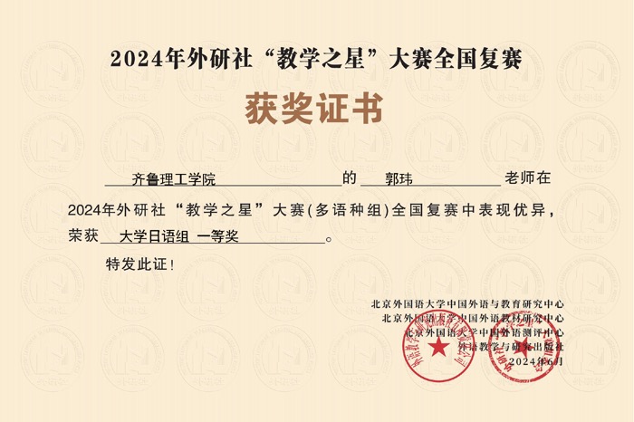 更新时间:2024-07-04 14:02 近日,2024年外研社“教学之星”大赛获奖名单揭晓,文学院5位参赛教师再获佳绩,日语语言文学教研室郭玮获多语种·大学日语组全国复赛一等奖;翻译教研室李勇、秦国华、乔雪、闫雯雯教学团队获本科英语组全国复赛二等奖。