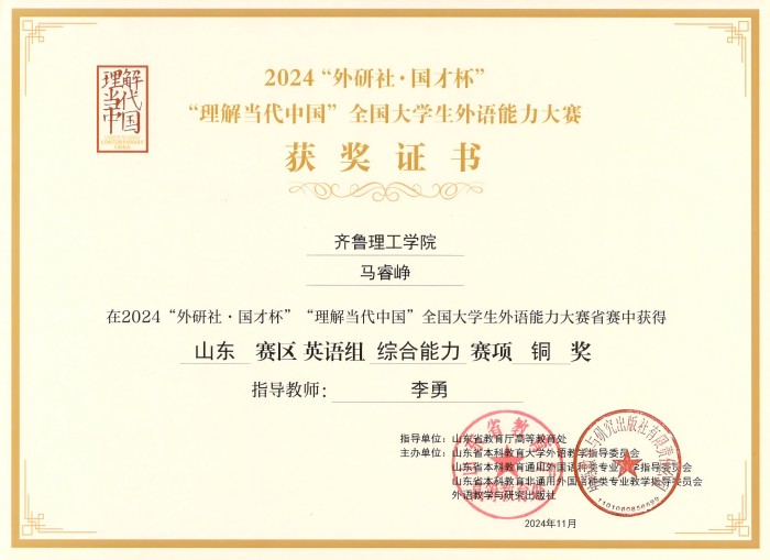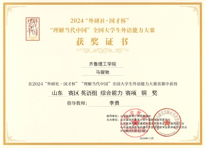 更新时间:2024-12-12 09:53 2024年11月份,2024“外研社·国才杯”“理解当代中国”全国大学生外语能力大赛山东省省赛顺利完赛。文学院学子以文会友、以言交锋,乘风破浪,斩获佳绩。
