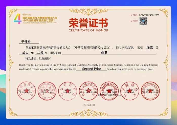 更新时间:2025-08-15 15:19 近日,由尼山世界儒学中心、中国孔子基金会等联合主办的第四届儒家经典跨语言诵读大会圆满落幕。文学院学子凭借扎实的语言功底、深厚的文化理解与出色的舞台表现,在近三万件参赛作品中脱颖而出,共获一等奖2项、二等奖2项、三等奖5项及优秀奖1项。其中,2022级英语专业于佳卉同学作为优秀代表,受邀出席大会年度盛典,展现了我院学子的风采。