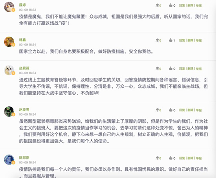 “思政大课”刚刚结束,在学校线上交流学习平台上,同学们抑制不住内心的激动,纷纷在键盘上敲出自己的“观后感”。不断刷屏的发言,出现频率最高的是大家平时很少说出的字眼:“英雄、逆行者、白衣战士、感动、感激、感恩、责任、震撼、坚定、家国、加油……”。突如其来的新冠肺炎疫情,让同学们对中国共产党的领导、对国家体制的强大、对中国特色社会主义制度的优势、对国家和人民的感情,就像化学反应一样,一下子产生了强大的共鸣、自豪、支持、信心。