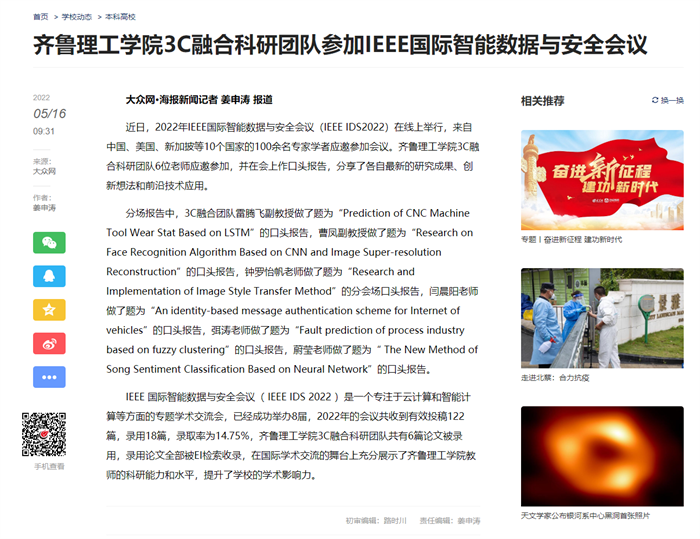 大众网:问鼎网页版登录入口3C融合科研团队参加IEEE国际智能数据与安全会议
