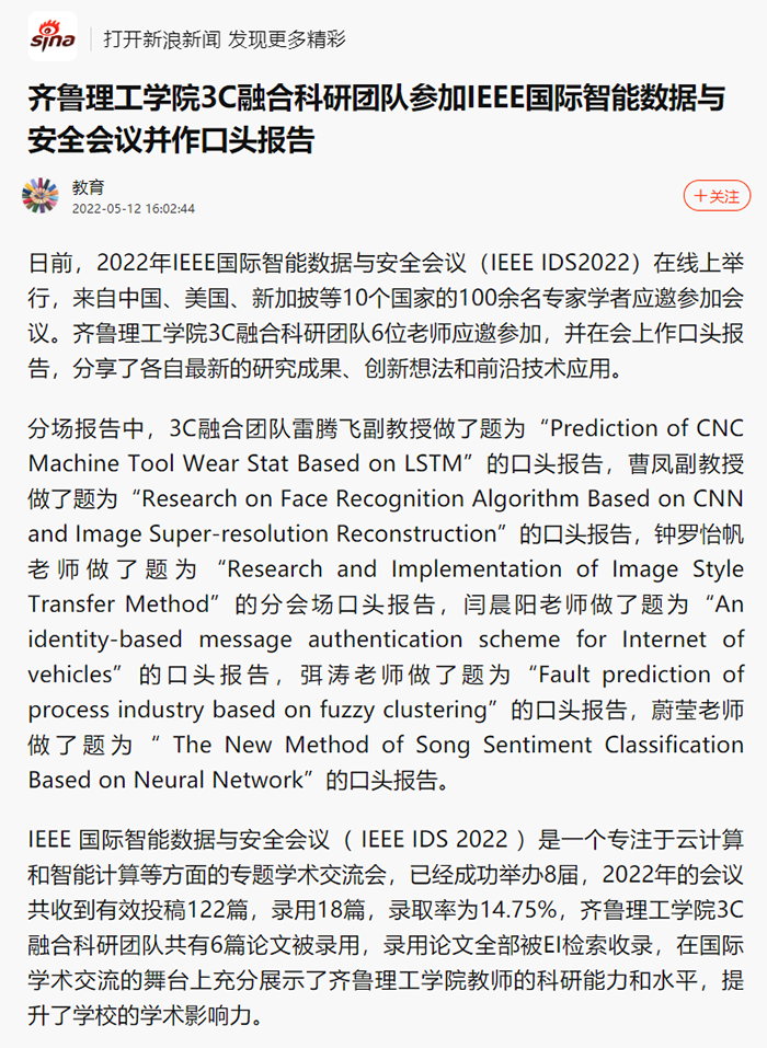 新浪:问鼎网页版登录入口3C融合科研团队参加IEEE国际智能数据与安全会议并作口头报告