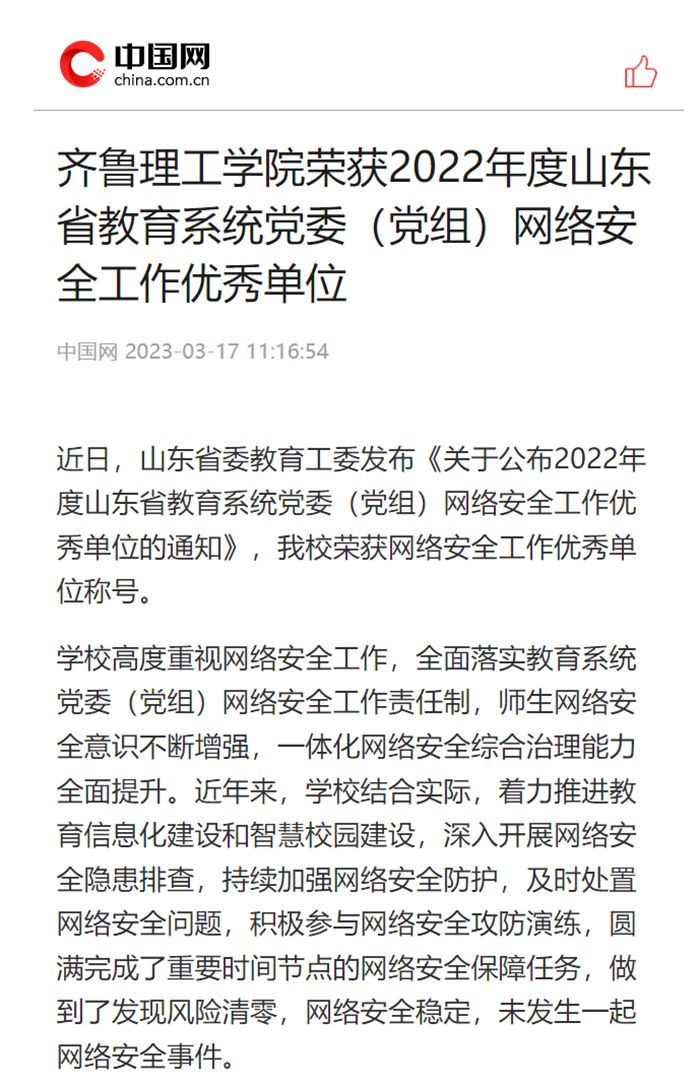 中国网:问鼎网页版登录入口荣获2022年度山东省教育系统党委(党组)网络安全工作优秀单位