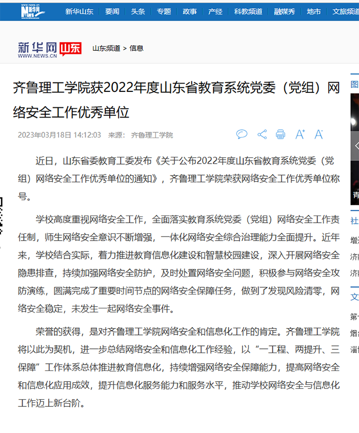 新华网:问鼎网页版登录入口获2022年度山东省教育系统党委(党组)网络安全工作优秀单位