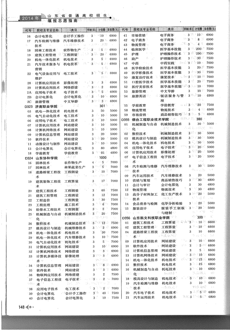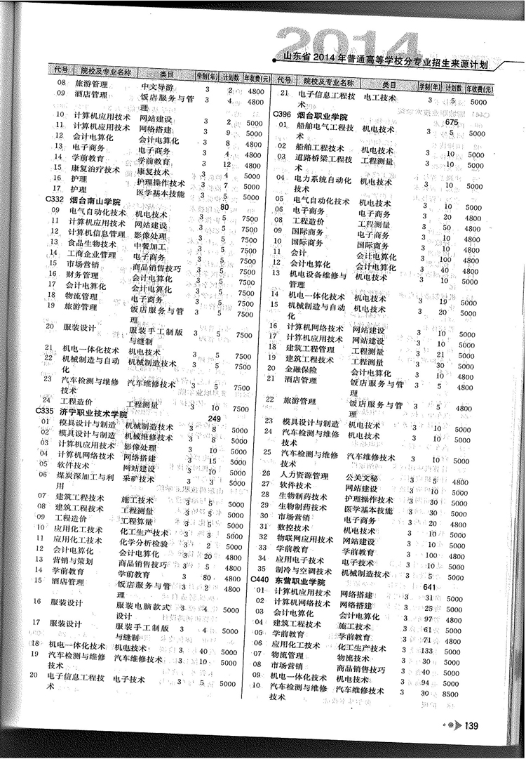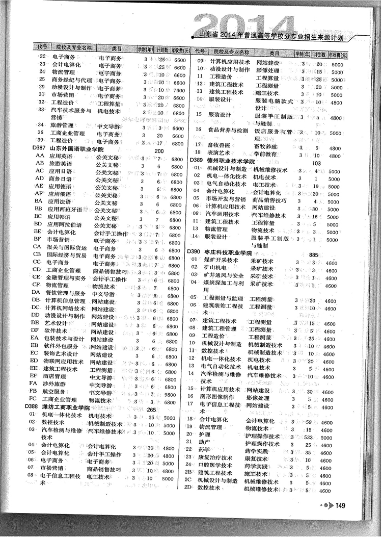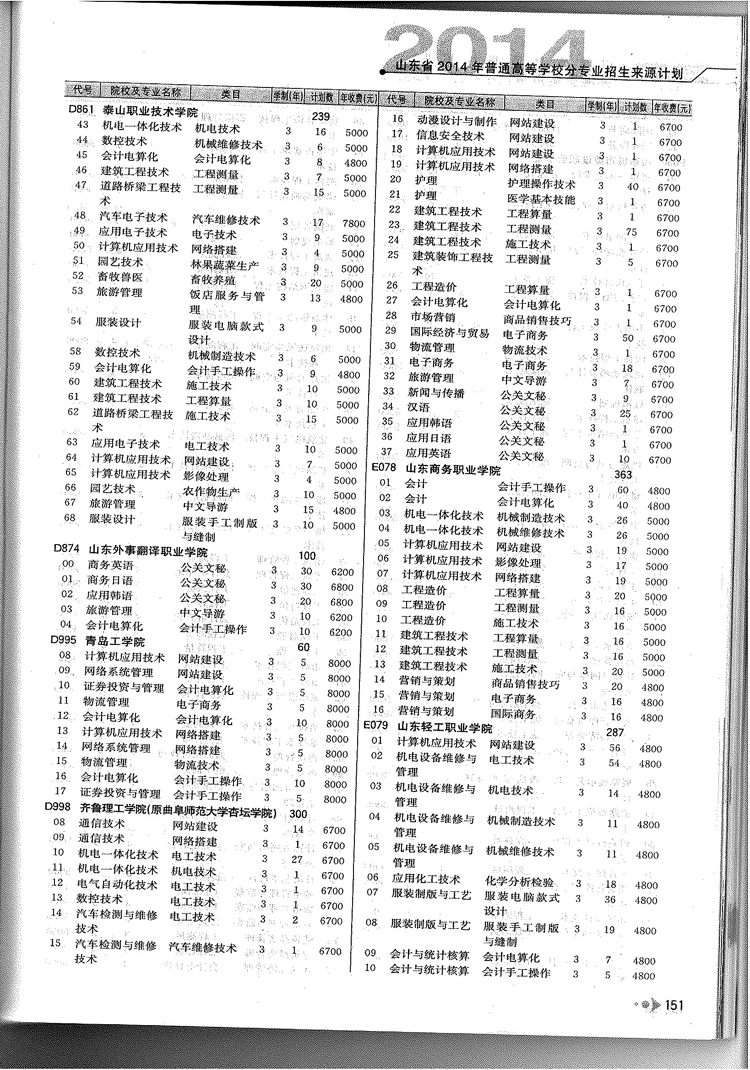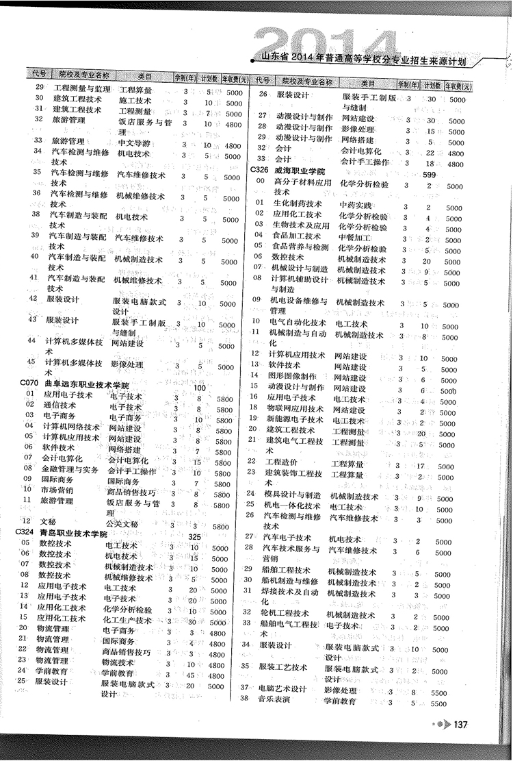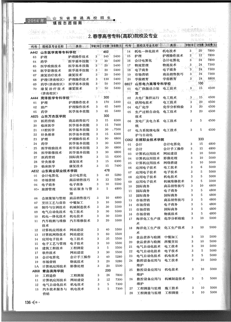 2014年山东省春季高考专科院校专业及计划