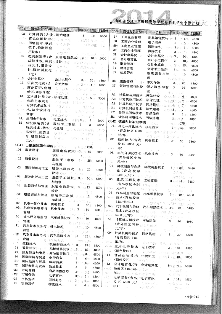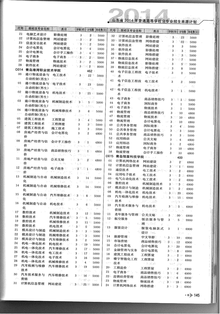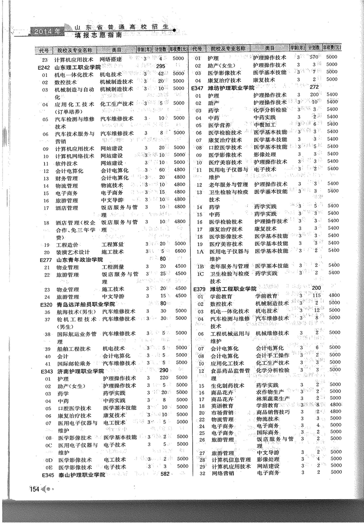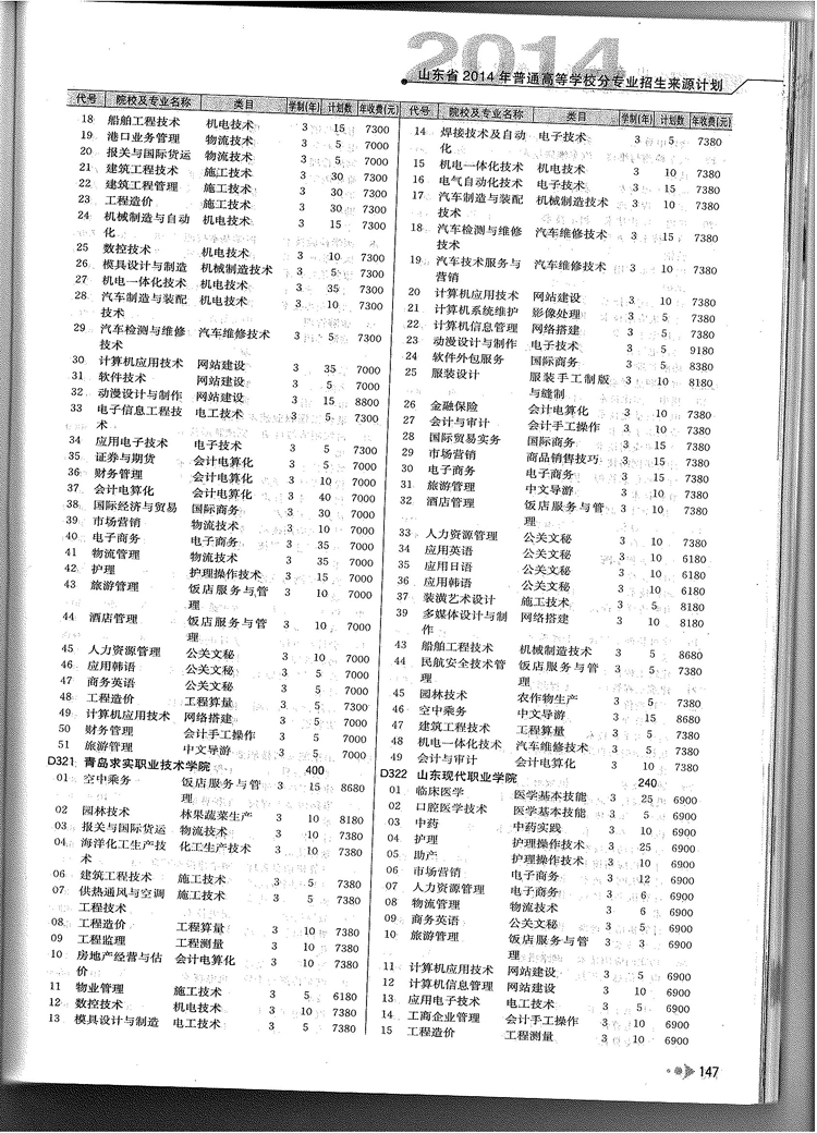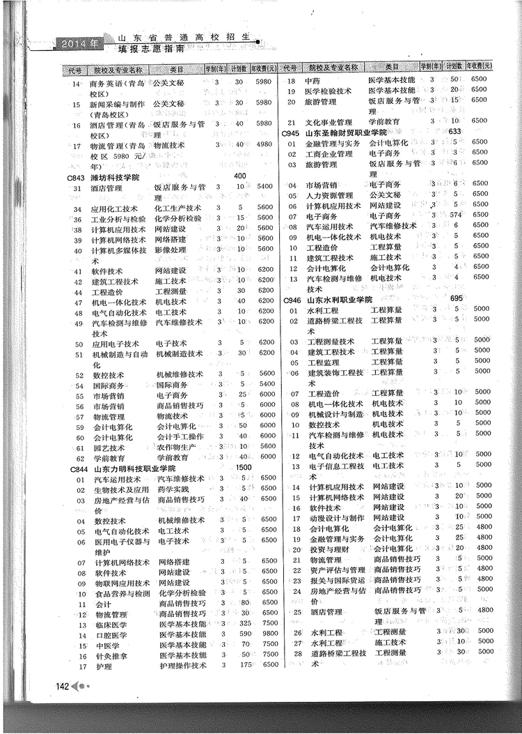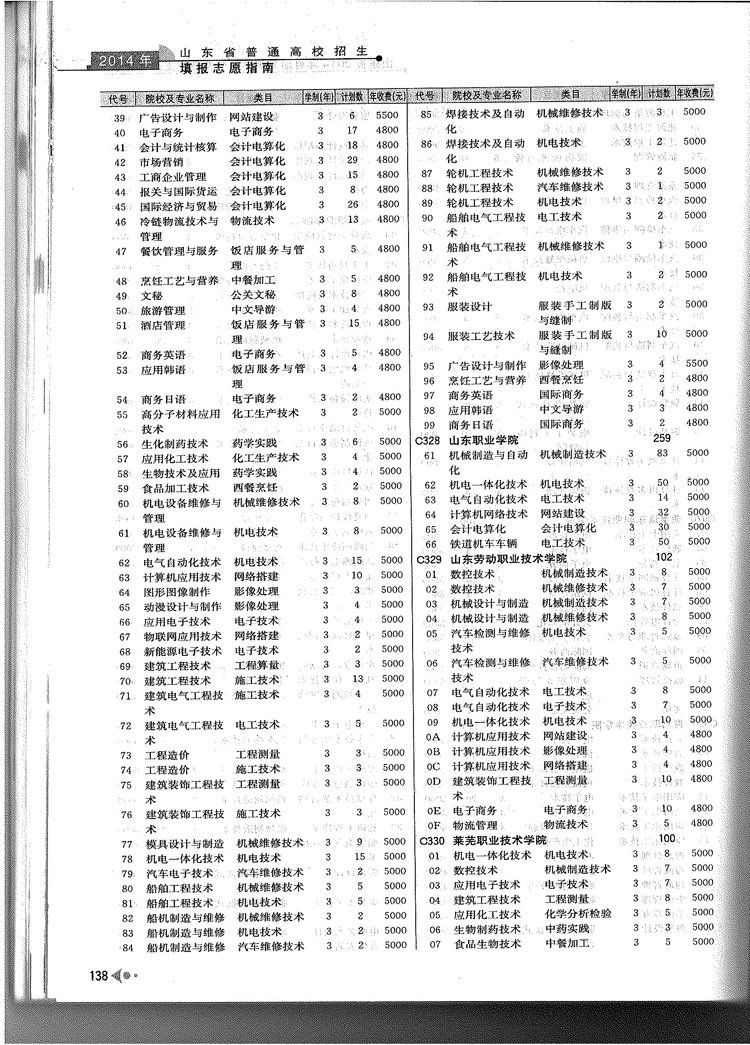2014年山东省春季高考专科院校专业及计划
