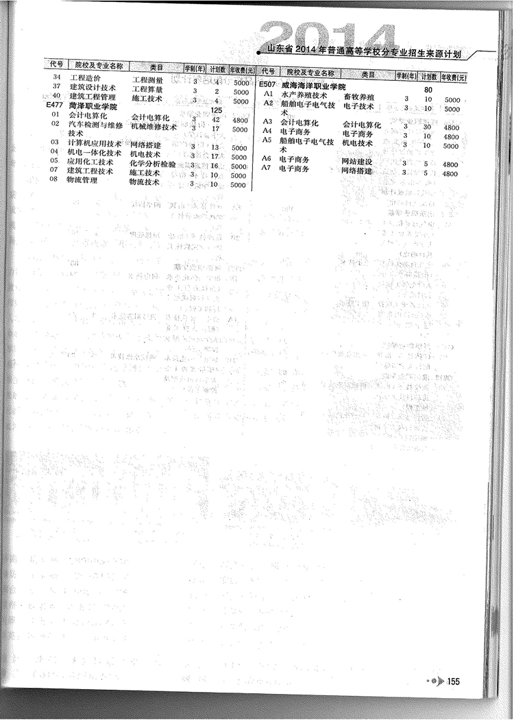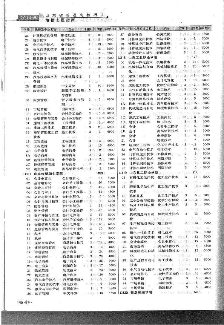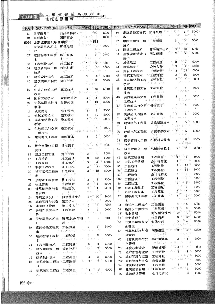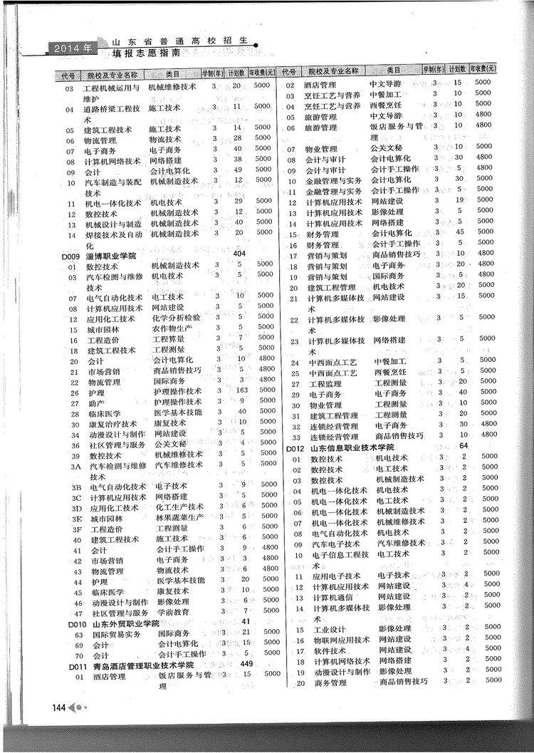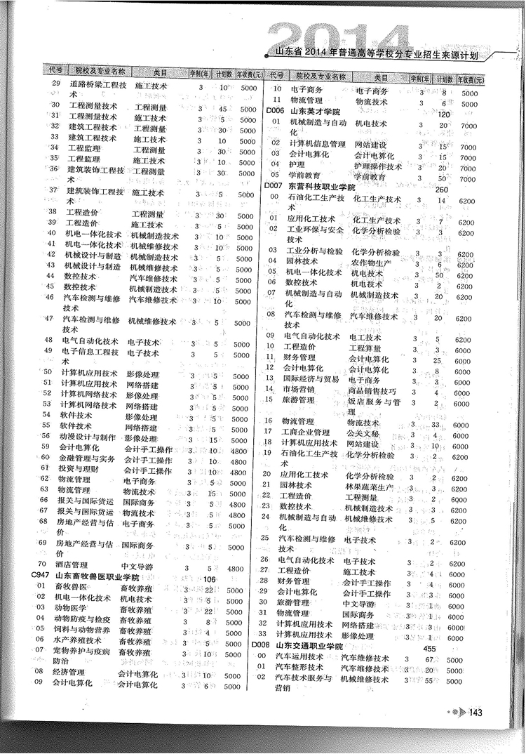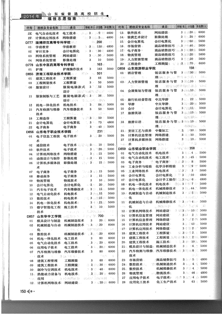 2014年山东省春季高考专科院校专业及计划
