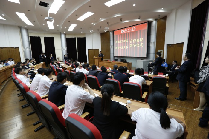 平泽大学国际教育院院长朴起彻在学院报告厅为我院部分师生做了专题报告,全面介绍了平泽大学的建设与发展情况,向在场的每一位学生赠送了从韩国专程带来的礼品。报告会后,平泽大学赵基兴校长一行参观了我院的图书馆、实验楼和十大实习实训中心。
