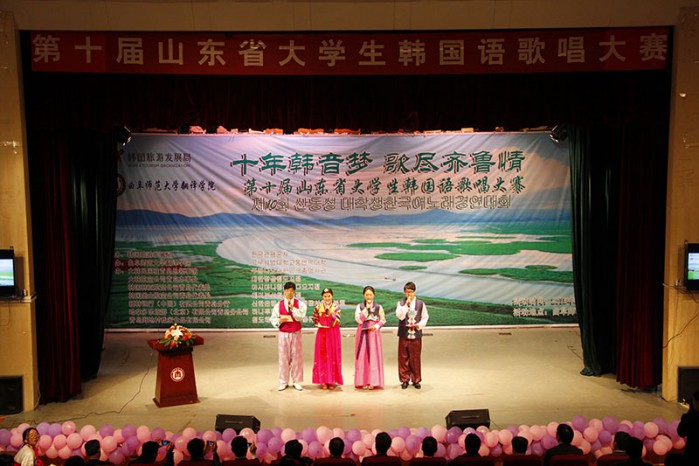 为进一步加强中韩两国在文化教育领域的交流与合作,促进山东省高校大学生对韩国文化的了解,提高学生学习韩国语的兴趣,5月9日上午,由韩国旅游发展局主办,曲阜师范大学承办,大韩民国驻青岛总领事馆,大韩航空,釜山航空,韩亚航空,HANA TOUR旅游社,新韩银行及青岛海地村我家食品有限公司协办的“十年韩音梦,歌尽齐鲁情”第十届山东省大学生韩语歌曲大赛在曲阜师范大学日照校区拉开帷幕。