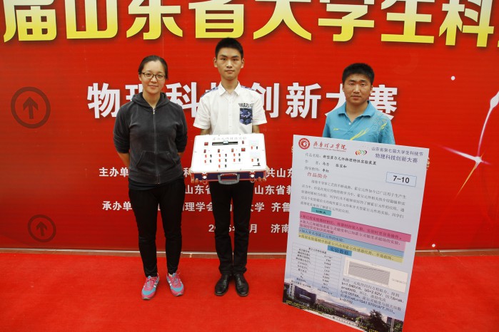 在山东省第七届大学生科技节物理科技创新大赛中,来自机电工程学院通信工程专业的2013级学生马力、张宝和组成的小组在李红老师、王蕴珊教授的指导下设计制作了《新型霍尔元件物理特性实验装置》、《低音炮灭火器实验装置的制作》两件作品,分别获得了大赛的一等奖和二等奖,成果喜人。