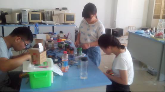 进入七月,骄阳似火。各组选手开始了创新展品的制作阶段。由于是初次参加省级规模的物理创新大赛,选手们有的是似火热情,缺的是经验和积累。材料没有购置齐全,大家就一起去市场,集中采购加单独选购;加工和制造过程,出力加出汗,把制作原料通过自己的双手变为符合要求的装置和测试仪器;实验和测试过程中,一次没有实现实验和测试目的,就分析产生的原因,继续下一次实验和测试;测试数据不理想,就进行严格的计算和处理,直到满意为止;展品制造太粗糙,就改善设计方案,制作出能够体现创新选手制作水平,具有一定技术含量的大赛展品。