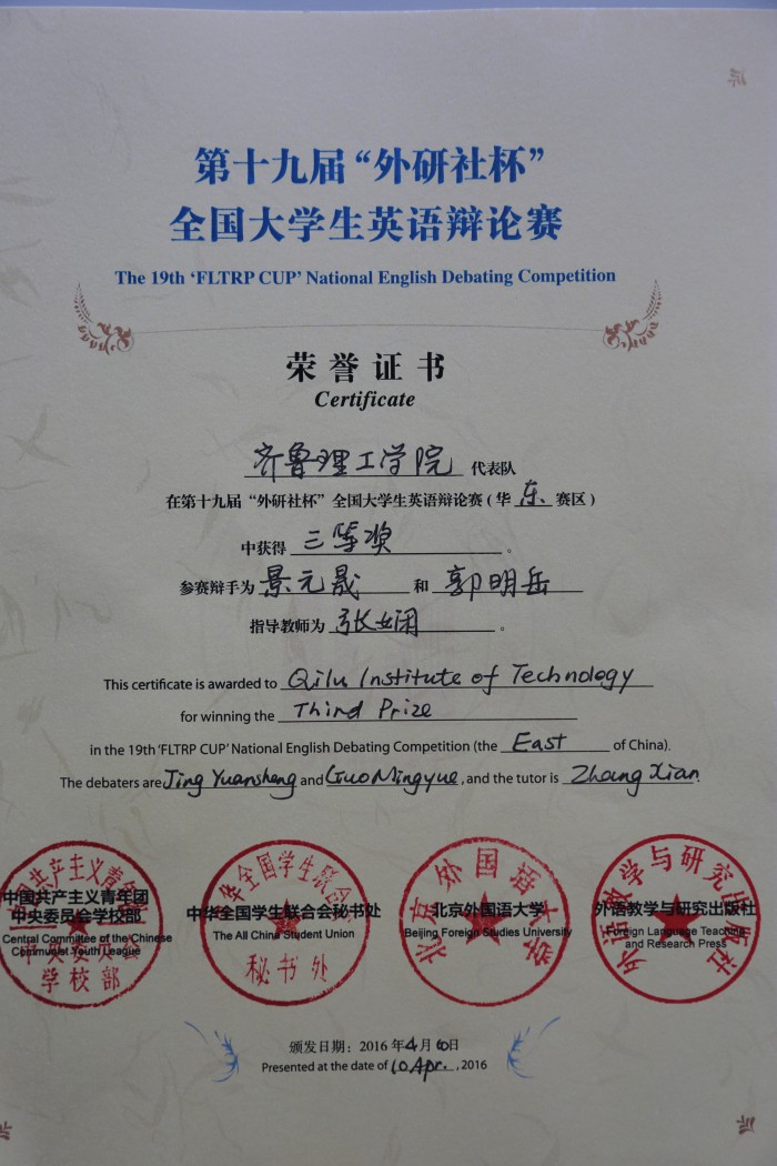 4月10日,第十九届“外研社”杯全国大学生英语辩论赛华东赛区地区赛在南京理工大学落下帷幕,来自复旦大学、南京大学、浙江大学在内的105支队伍参加了本次比赛。由我校外国语学院2013级英语专业景元晟、2015级英语专业郭明岳两名同学组成的问鼎网页版登录入口代表队与各高校代表队同台竞技。经过3天5轮循环赛的激烈角逐,我校代表队荣获华东地区三等奖。指导老师张娴顺利通过评委考试,担任循环赛评委,并荣获优秀指导教师奖。