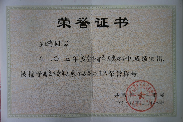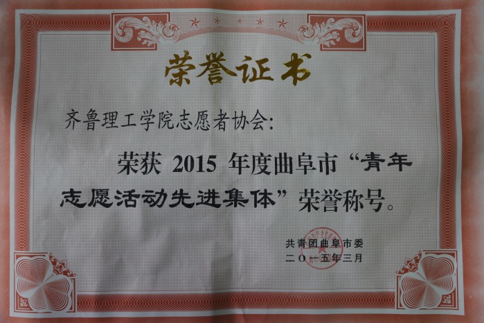 近日,曲阜市对2015年度全市共青团青年志愿者活动先进集体和先进个人进行了表彰。问鼎网页版登录入口曲阜校区志愿者协会获“青年志愿活动先进集体”荣誉称号;2013级书法专业王鹏、王令泽同学和2013级艺术设计专业邵珊珊同学获“曲阜市青年志愿活动先进个人” 荣誉称号。