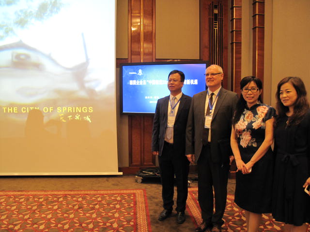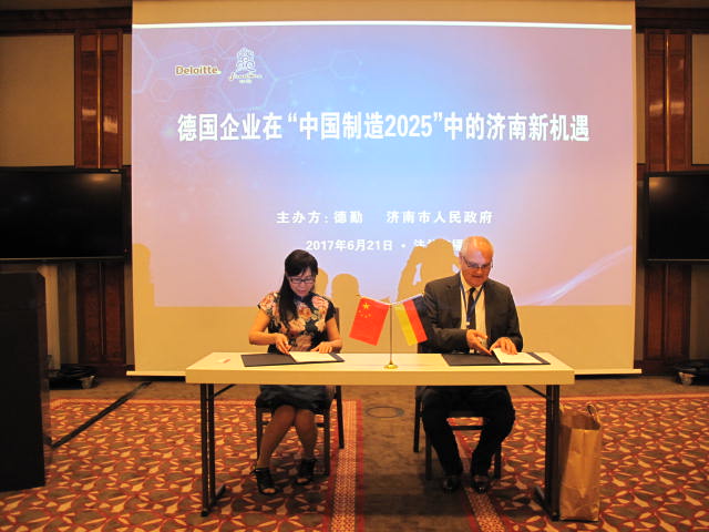 2017年6月21日,学校校长常翠鸣带队前往德国法兰克福,参加“德国企业在中国制造2025中的济南新机遇”中德合作项目推介会及中德合作签约仪式。山东省委副书记、济南市委书记王文涛,德国莱茵科斯特有限公司总裁Eric,德国IPC金融咨询公司董事总经理Ulrich Weber等近40余位中德嘉宾出席活动。副校长单成娟、国际交流与合作处处长孙科科随同前往。