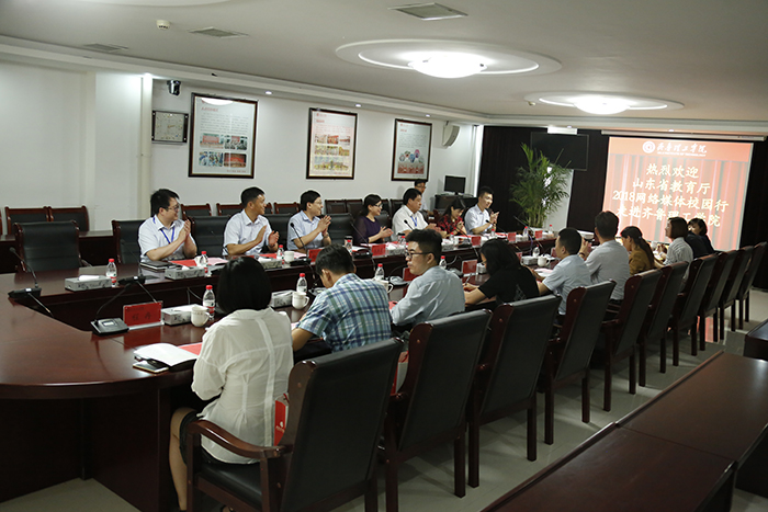 2018年6月26日下午,山东省教育厅新闻中心主任宋全政带领人民网、新华网、中国网等8家网络媒体的记者来到我校,进行工作指导及采访交流。校长常翠鸣,副校长张庚灵,副校长、总督学魏希启,副校长单成娟,网络信息中心主任肖滋健,宣传部部长乔石参加座谈会。座谈会由副校长张庚灵主持。