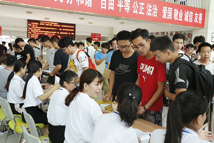报到现场工作人员和志愿者的身影随处可见,现场报到审核有序进行