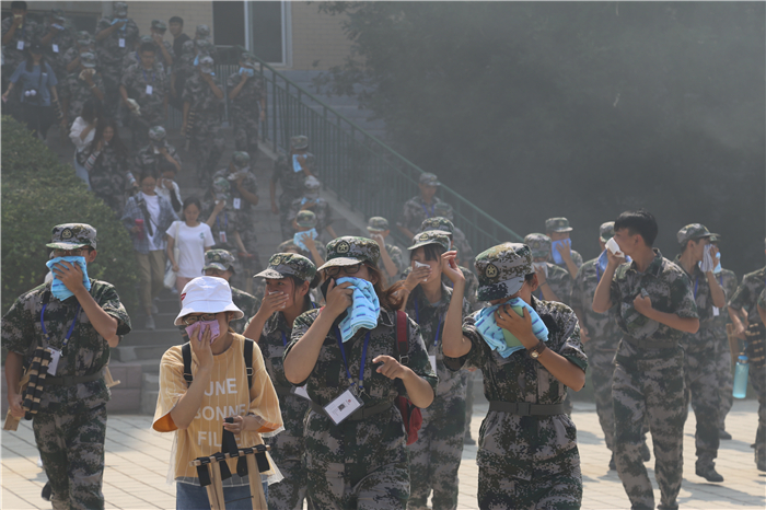 随着警报声的响起,演练正式开始,各班辅导员及承训教官协助学生队伍快速、有序地撤离。在辅导员及教官的正确指导下,学生们都能按要求弯着腰,用手绢、纸巾或手捂住鼻子,跟着队伍迅速撤离到教学楼外集结场地。整个过程中,师生们行动快速,配合默契,现场井然有序。