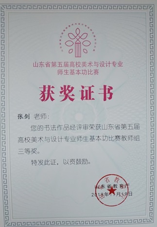 9月21日至23日,山东省第五届高校美术与设计专业师生基本功比赛在山东工艺美术学院举行。来自全省95所高校的1237名师生参加了本次比赛。近日,山东省教育厅公布了山东省第五届高校美术与设计专业师生基本功比赛评选结果,我校艺术学院教师赵华伟老师获书法教师组一等奖、张剑老师获书法教师组三等奖;书法学专业田忠乐同学获书法学生组二等奖;宋利林、耿闻培、宋伟、宁治威、李雅分获书法学生组三等奖,张昭获篆刻学生组三等奖;视觉传达设计专业白圆圆、李雪刚、江晓倩分获设计类三等奖。