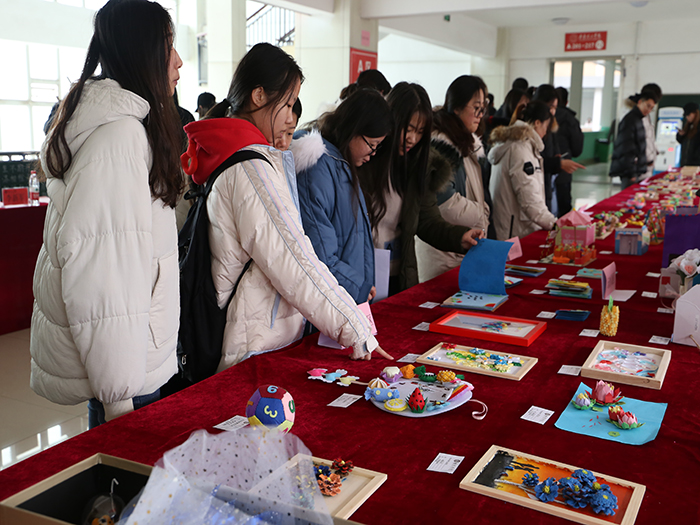 来自教育学院学前教育专业的200余件优秀作品,分为书法、美术、手工三个大类,包括泥塑、衍纸、玩教具、剪纸、儿童画、毛笔字、黑板字、纸浮雕、主题墙设计等九项。作品独具创新精神,“妙手生花 童趣无限”, 充分展现了我校学前教育专业的教学成果和育人质量。汇报展出期间,评委老师们对同学们的优秀作品给予充分肯定和细致点评,学生们悉心听取意见,对自己的作品有了更深刻的认识,并对未来职业发展充满希望。