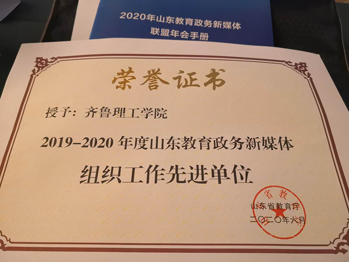 6月19日,2020 山东教育政务新媒体联盟年会在青岛举行,会议对山东教育政务新媒体综合力十强单位、先进单位、组织工作先进单位、战“疫”先进单位、进步单位以及对优秀案例进行了表彰。我校荣获“山东教育政务新媒体组织工作先进单位”称号。