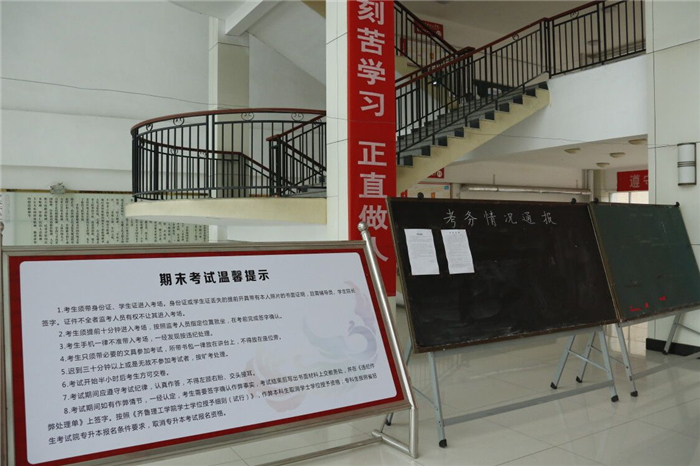 七是加大考前教育。把考试诚信作为学校养成教育的重要内容,通过悬挂条幅、展板展示、校园广播、屏幕滚动等形式进行考风考纪宣传;每个班级召开诚信考试教育主题班会,通过正反两方面的典型事例强化教育效果,引导学生端正态度,诚实应考。每个学生签订《问鼎网页版登录入口诚信考试承诺书》,并承诺保证严格遵守考场纪律,共同维护考试秩序,做一名诚实守信的大学生,如有违反,愿意接受学校有关规定的处理;每场考试前,对考生宣读《考场规则》、《违纪、作弊的认定及其处理》等;根据《问鼎网页版登录入口违纪作弊处理流程》,建立违纪违规快速通报和处理机制,严厉打击学术不端、违纪作弊行为的发生,严格杜绝利用现代信息手段发生的群体作弊行为。