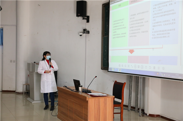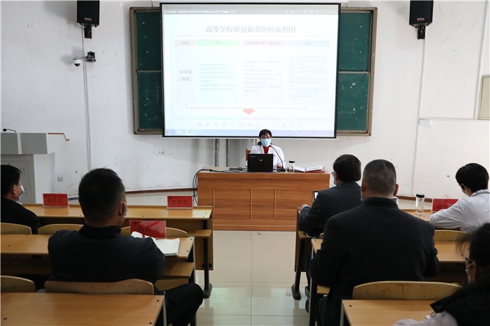 为确保本次应急演练顺利进行,实战演练前,学校进行了疫情防控应急演练具体实施方案的部署。疫情防控工作领导小组组长、校长常翠鸣对照高等学校新冠肺炎疫情防控工作流程图逐项进行了讲解,并对此次演练的重点内容、环节及注意事项进行了部署。