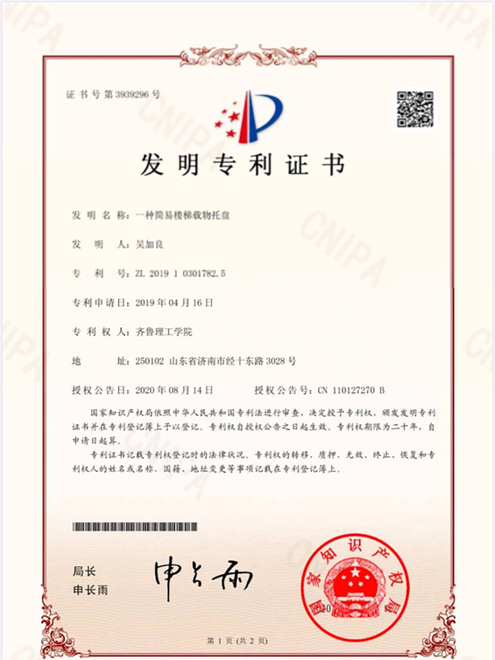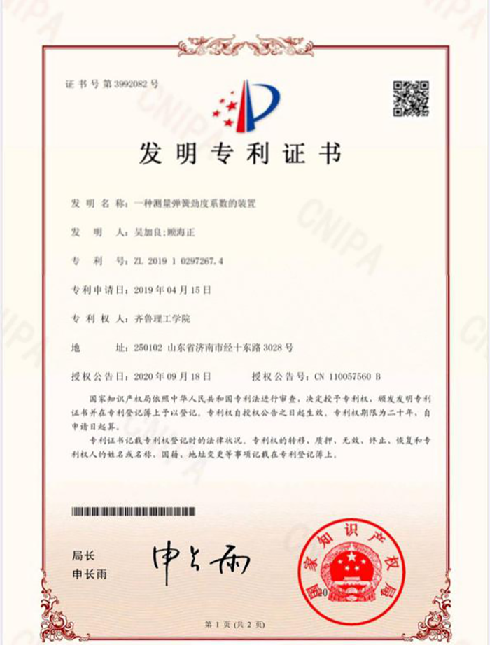 近日,我校机电工程学院吴加良老师连续获得两项国家发明专利授权,分别是:“一种测量弹簧劲度系数的装置”(专利号:ZL 201910297267.4)、“一种简易楼梯载物托盘”(专利号:ZL 201910301782.5)。