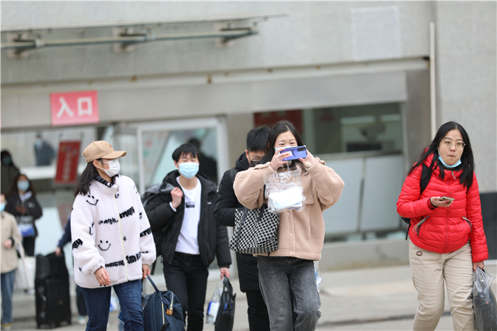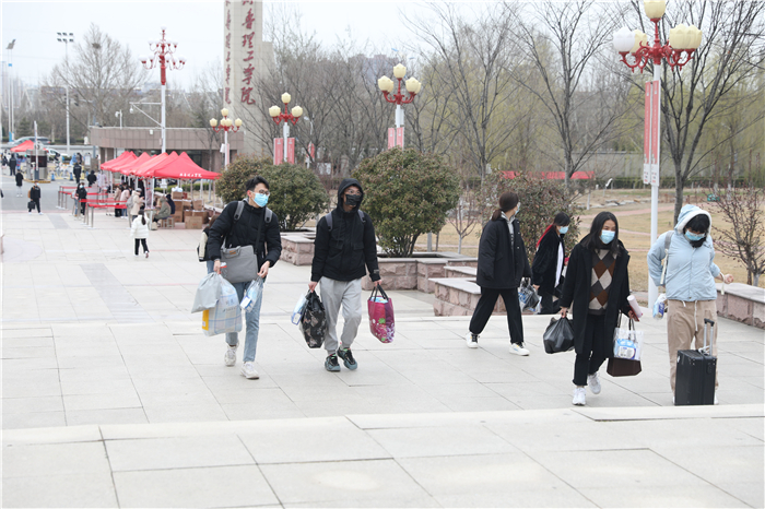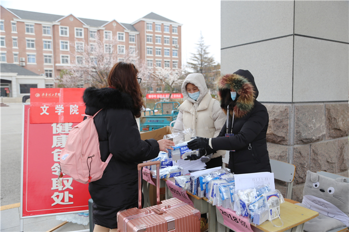 学校为同学们平安返校做了充分准备和悉心安排。在校门口,学校专门安排了车辆帮助返校学生托运行李,一身轻松的同学们有序排队,依次出示健康码、扫描核验身份、消毒、测温、领取并更换口罩后进入校园,整个返校过程秩序井然。在报到现场,各二级学院的院长、老师们一边迎接自己的学生,一边为大家发放“爱心健康包”。宿舍楼前,老师和志愿者帮着学生把行李一件件搬到宿舍,尽管天气寒冷,但是看到学生们能够平安回来,还是觉得所有的付出都是值得的。
