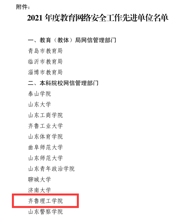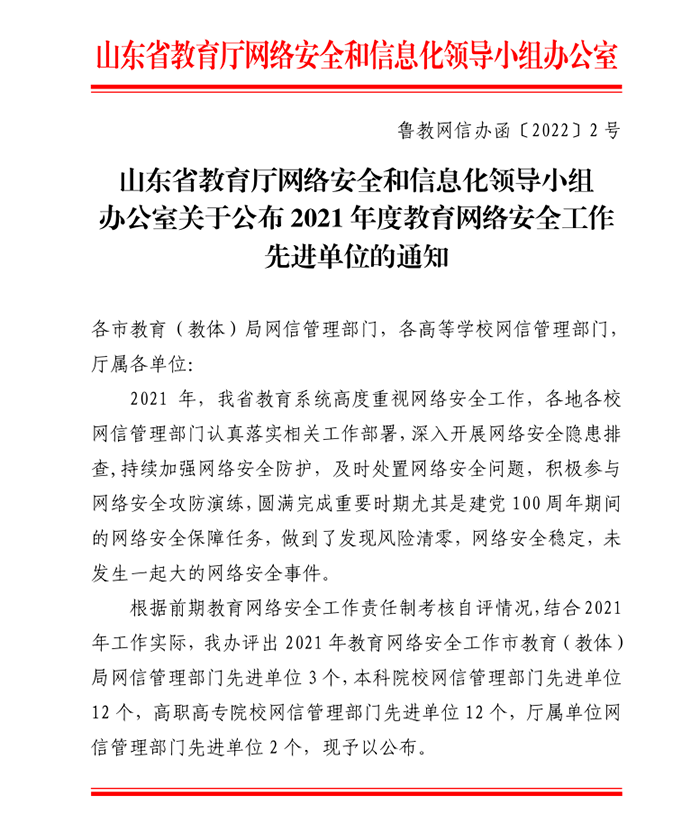 近日,山东省教育厅发布《山东省教育厅网络安全和信息化领导小组办公室关于公布2021年度教育网络安全工作先进单位的通知》,我校被山东省教育厅评为2021 年度教育网络安全工作先进单位。