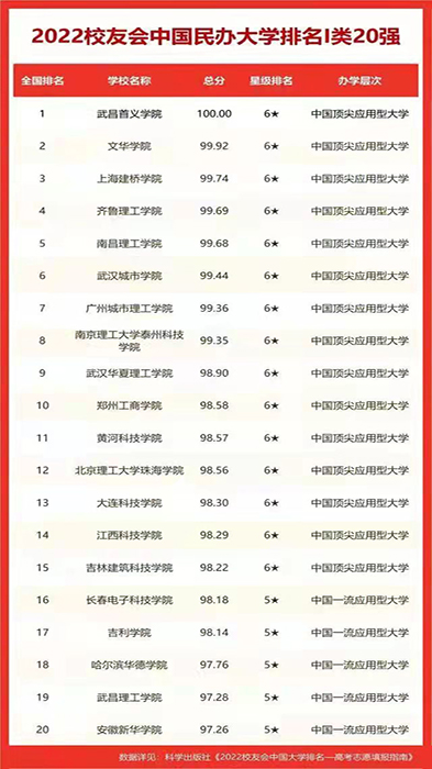 1月25日,全国第三方大学评价机构艾瑞深校友会网(Cuaa.Net)正式发布2022校友会中国大学排名,我校榜居民办大学排名I类全国第四。