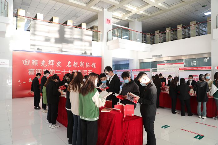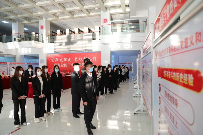 为深入推进党史学习,庆祝党的二十大胜利召开,10月19日下午,学校党委组织各学院学生党员到图书馆一楼大厅参观学习百年党史展和红色经典图书展。