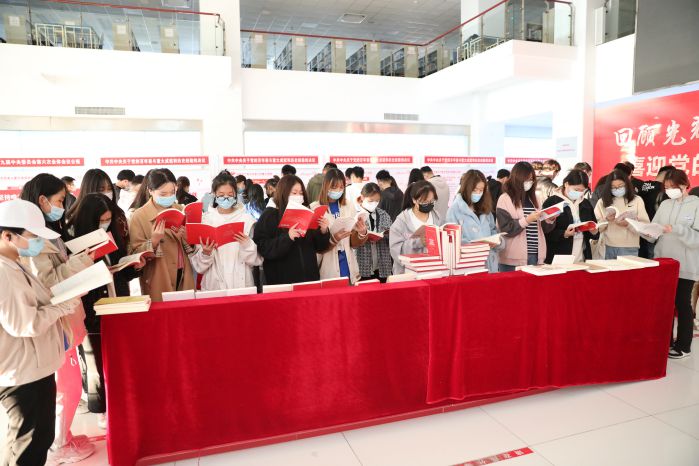 大厅中央是学校图书馆展出的百种红色经典图书,包括习近平总书记重要论述、重要文献选编、中共党史人物传、中国共产党人的精神系列、中国共产党的初心和使命等。党员们拿起一本本红色经典,重温红色记忆,一起回顾党的奋斗历程,充分展现了中国共产党伟大光荣的百年辉煌以及新思想新理论武装奋进新征程。