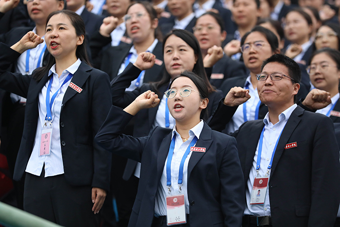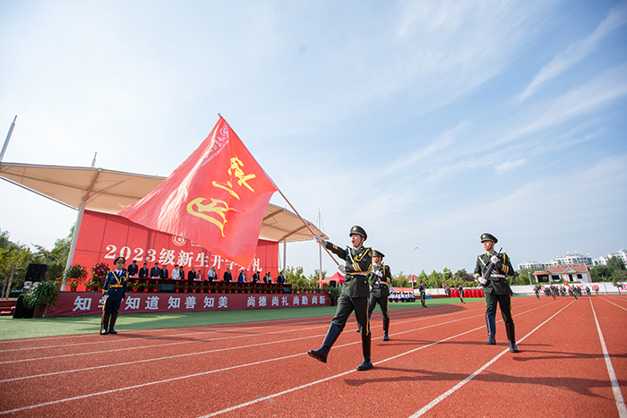 在鲜艳的五星红旗下,全体教师和2023级新生举起右手庄严宣誓。老师们立志牢记为党育人、为国育才的初心使命,树立“躬耕教坛、强国有我”的志向和抱负;2023级新生们,用铮铮之声表达“请党放心,强国有我”的决心。