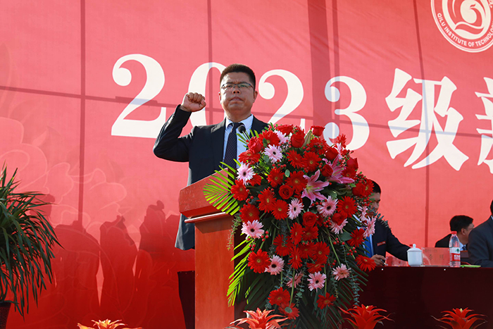 典礼上,2023级新生代表杨瞻铎、高迎博同学发言,立志将不断提升自我综合素质和实践技能,让青春在奋斗和奉献中绽放绚丽光彩。
