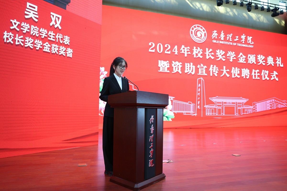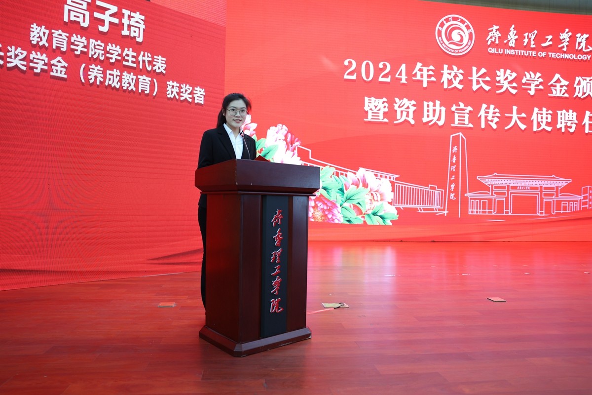 典礼上,对获得2024年校长奖学金的学生进行了表彰,为资助宣传大使颁发了聘书。获奖学生代表、教育学院高子琦和文学院吴双同学分别发言,表达了感恩之情与奋进之志。
