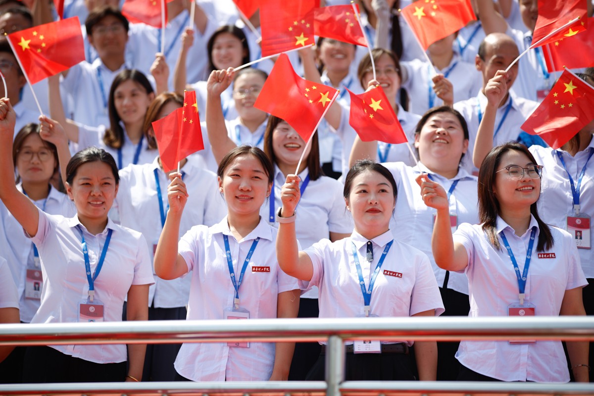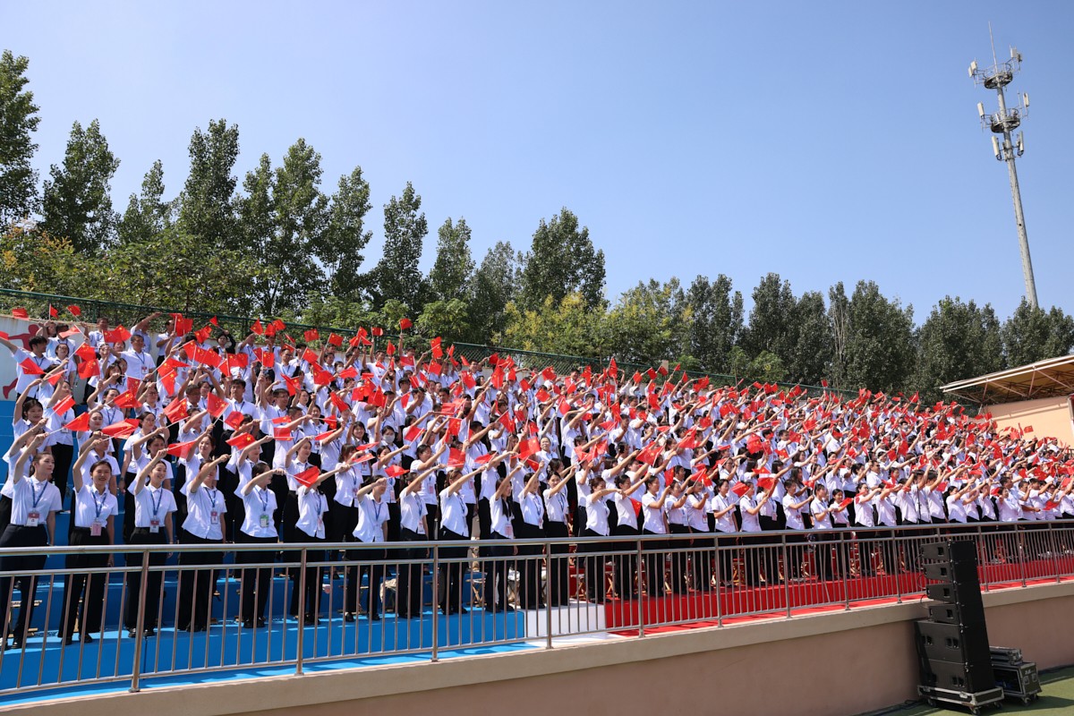 典礼最后,全场起立,万名师生挥舞手中的国旗,深情唱响《我和我的祖国》,表达对伟大祖国繁荣昌盛的美好祝愿!