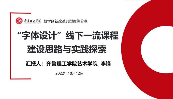 分享会上,李锋老师以《字体设计》线下一流课程建设思路与实践探索入手,从字体设计课程概述、课程建设思路与实践探索、教学改革成效三个方面展开介绍,详细介绍了课程团队情况、课程建设历程、以及课程目标等内容,从重塑课程内容、巧融德育元素、引入真实项目和构建课程全过程评价体系四个方面阐述了《字体设计》课程建设路径,同时从专家评价、学生评价、教研成果、学生参赛和课程推广五个方面详细介绍了我校教学改革成效。