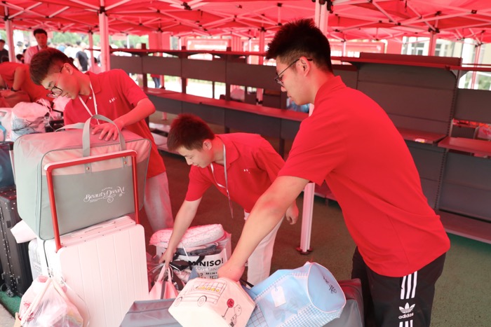 志愿者接过新生手中的行李,提醒道: